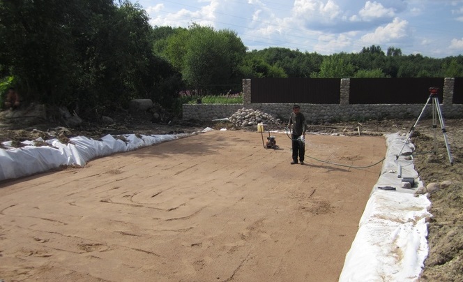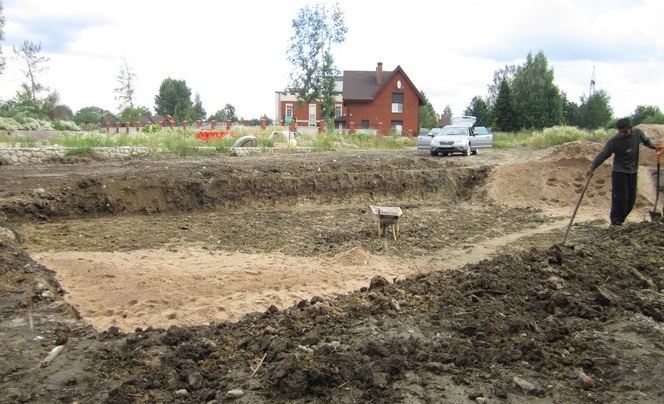 Наиболее ответственным этапом выступает расчет плитного фундамента. И только после этого осуществляется его закладка, которая сопровождается проведением земляных работ. Вырытый котлован трамбуется при помощи специальной машины и осуществляется формирование гравийно-песчаной подушки. Поверх подушки укладывается гидроизоляция в несколько слоев, заливается небольшой слой бетона.